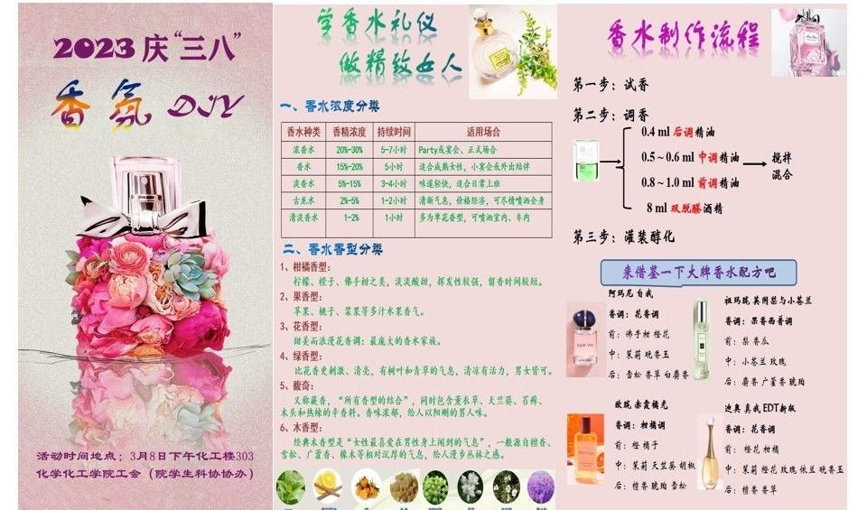 活动开始,院科协周诗晗部长为大家详细介绍了香水的正确使用方法以及香水的制作流程等:香水,一般可分为前调、中调、后调。前调通常是由挥发性的香精油所散发,味道一般较浓烈,大多为花香或柑橘类成分的香味,维持时间较短;中调是在前味消失之后开始发出香味,是一款香水的精华所在,通常由含有某种特殊花香、木香、及微量辛辣刺激香制成;香水的后调也是常说的余香,由微量动物性香精和雪松、檀香等芳香树脂所组成,给予香水一种深度,持续时间最长久。