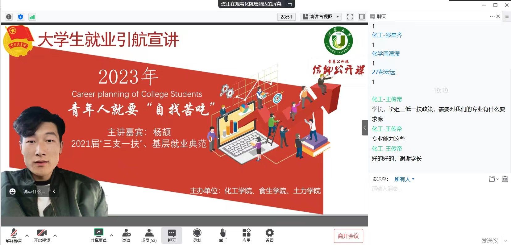 本次讲座分为经验分享和交流互动两个环节。杨颉以青年人就要“自找苦吃”为主题为同学们分享了自己在“三支一扶”中的基层服务经验,并面向同学们宣传了“西部计划”和“乡村振兴计划”。在会议中,杨颉同学跟同学们详细的介绍了“三支一扶”的相关政策和注意事项,以及自己在基层工作的心得和感悟。并针对同学们提出的“三支一扶”项目是否对专业能力有要求、当初为什么会报考“三支一扶”项目,初衷是什么等同学们感兴趣的问题一一做出了解答。