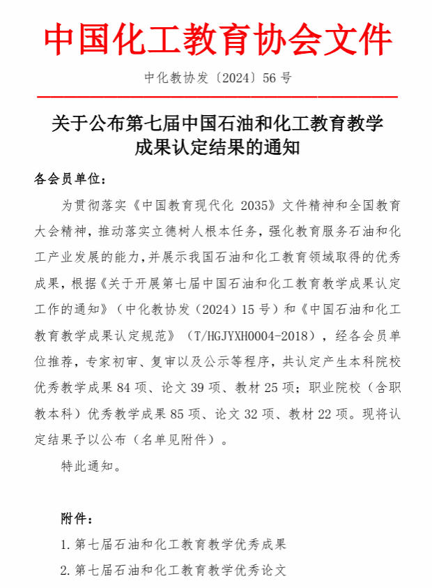 近日,中国化工教育协会公布了第七届中国石油和化工教育教学成果认定结果,英国365上市公司申报的项目,五“化”并举,四“工”融合——化工类卓越人才培养模式创新与实践,荣获第七届中国石油和化工教育教学成果奖一等奖。
