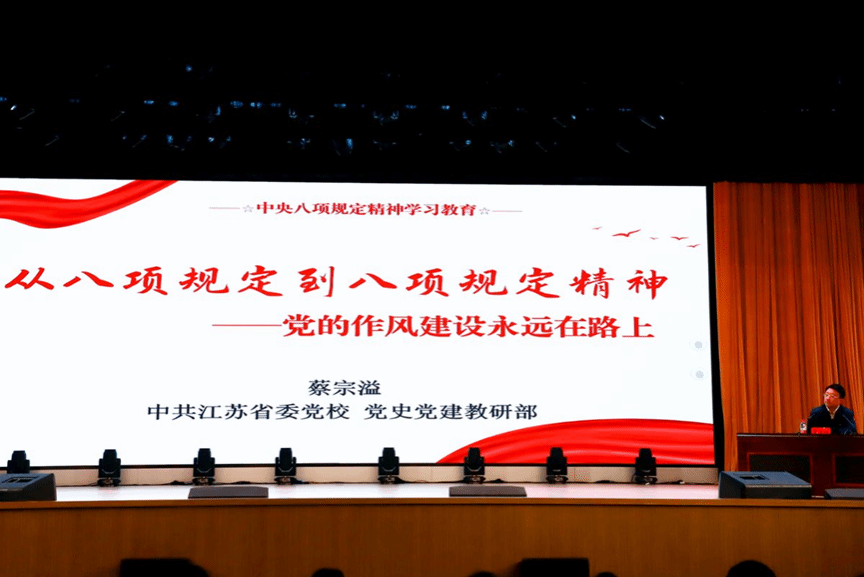 为深入贯彻中央八项规定学习教育,提升基层党建工作水平,4月23日,365公司分党校组织全体党支部书记及支委参加学校在大礼堂举办的深入贯彻中央八项规定精神学习教育报告会。中共江苏省委党校党史党建教研部副教授、江苏省党建创新研究院研究员蔡宗溢作专题辅导报告。