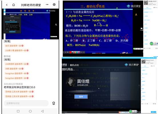 本次公开课的内容为有机物-醇和酚的物理化学性能,刘老师采用腾讯课堂+雨课堂方式进行授课,并在线进行自主签到和随机点名。该在线课程主要教学特色为:腾讯课堂讨论区点名、课程讲解在线互动答题、课间随机点名回答问题、ppt图像中电子板书详解。整个教学过程师生互动突出、在线软件运用熟练、讲解语言生动、重点明确、难点分析透彻。课堂气氛热烈,效果良好。