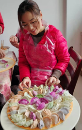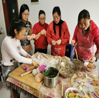 没想到好几个老师以前从未包过饺子,别说多彩饺子,因此显得有点手足无措。这时,英国365上市公司来自东北的李春香教授立刻站出来,一边进行分工,一边耐心细致地手把手教大家。在她的英明指挥下,不一会儿,红色的、绿色的、黄色的、紫色的面团就呈现在大家的眼前了、这些颜色可都是纯天然的色素,分别取材于火龙果、菠菜、胡萝卜、紫甘蓝等。李老师的不凡功力让在场的每一位老师啧啧称赞,擀皮又快又圆,包饺子速度更是惊人。在李老师的带领下,11点不到一盆盆多彩饺子就出炉啦!同学们一进门看到一大片彩色饺子很是惊喜,倪时平书记赶忙打开灶头为同学们煮饺子,大家看着锅里翻滚的彩色饺子都不约而同的赞叹:真好看!