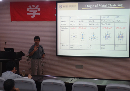 Dr. Lachgar's presentation entitled "Framework Engineering of Cluster-based Materials". Besides a briefly introduction the great significance and main development of cluster-based material during the past twenty years, Dr. Lachgar gave a critical review on the supramolecular self-assembly based on hexanuclear niobium cluster as the basic building units carried out in his own lab. The material based on hexanuclear niobium cluster maybe potential useful material for adsorption and catalysis. Dr Lachgar's presentation was full of humor and understandable, the attendees benefited a lot from the presentation. Dr. Lachgar also discussed with many concerned topics with the students during the presentation, such as studying abroad, research methods and attitude. After the presentation, Dr. Lachgar discussed the possibile cooperation between the two universities with the school leaders, which includ joint training of undergraduate students, exchanging training of graduated students, etc. He promised to submit proposal to his university once he back to the USA, the prospect of the cooperation between the two universities would be great.