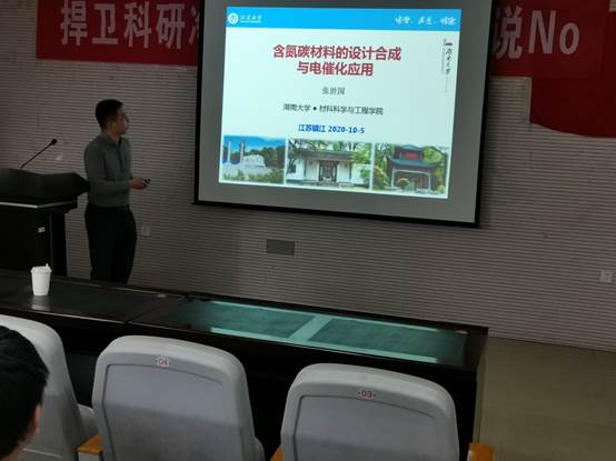 张世国教授的报告题目为《含氮碳材料的设计合成与电催化应用》,报告主要讲解了利用质子酸离子液体(盐)作为单一小分子前驱体合成碳材料,利用质子酸离子液体(盐)的结构多样性,对有机前驱体与碳材料之间的构效关系进行了深入系统性研究,并对碳材料中氮含量的上限值进行了推导,进一步探索了含氮碳材料在小分子电催化领域中的应用,在座师生获益匪浅。