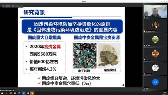 卞振锋教授以“固废中贵金属的光催化绿色回收”为题,主要讲解了采用光催化方法进行固废中贵金属清洁回收的研究现状和应用前景。固废中贵金属回收过程涉及使用强酸和释放毒气、有毒重金属离子,环境污染严重。如何实现贵金属清洁回收是环保领域研究热点。卞振锋教授课题组通过光催化氧化实现贵金属的溶解,发展适合多种贵金属的光催化清洁回收技术,探究贵金属选择性溶解回收的调控机制。系统研究贵金属原子表面活化、迁移以及光催化氧化途径。发展适用于在温和条件下,能够实现快速从电子垃圾、废汽车尾气三效催化剂、废贵金属负载型催化剂甚至矿石废渣中回收贵金属的通用方法,为光催化规模化贵金属清洁回收提供理论基础。
