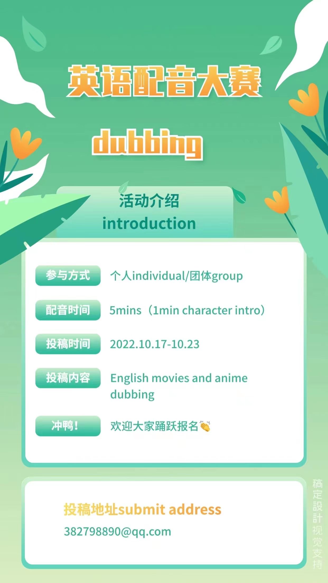 Step2: This activity supports individual participation and team participation. Each participant/team can submit a 5-minute English dubbing clip to the Email:382798890@qq.com,and the deadline: October23.