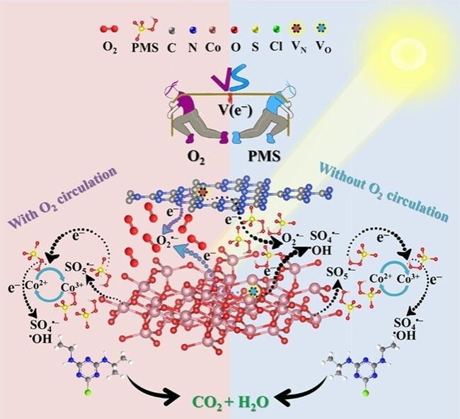 The regulation of peroxymonosulfate (PMS) activation by photo-assisted heterogeneous catalysis is under in-depth investigation with potential as a replaceable advanced oxidation process in water purification, yet it remains a significant challenge. Herein, we demonstrate a strategy to construct polyethylene glycol (PEG) well-coupled dual-defect VO−M–Co3O4@CNx S-scheme heterojunction to degrade organic pollutants without aeration, which dramatically provides abundant active sites, excellent photo-thermal property, and distinct charge transport pathway for PMS activation. The degradation rate of VO−M−Co3O4@CNx in anaerobic conditions shows a higher efficient rate (4.58 min−1 g−2) than in aerobic conditions (1.67 min−1 g−2). Experimental evidence reveals that VO−M−Co3O4@CNx promotes more rapid redox conversion of photoexcited electrons induced by defects with PMS under anaerobic conditions compared to aerobic conditions. Additionally, in situ experiments and DFT provide mechanistic insights into the regulation pathway of PMS activation via synergistic defect-induced electron, revealing the competitive effect between O2 and PMS over VO−M−Co3O4@CNx during the reaction process. The continuous flow reactor and flow cytometry results demonstrated that the VO−M−Co3O4@CNx/PMS/Vis system has remarkably enhanced stability and purification capability for removing organic pollutants. This work provides valuable insights into regulating the heterologous catalysis oxidation process without aeration through the photoexcitation synergistic PMS activation.