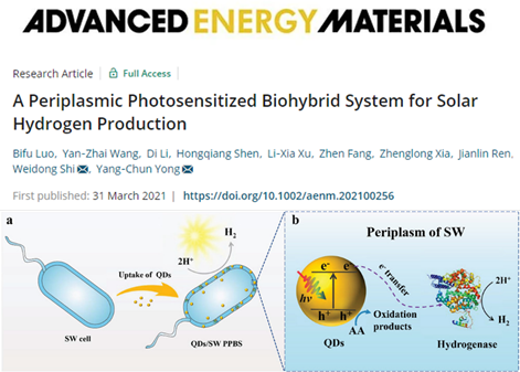近日,英国365上市公司施伟东教授团队与生物质能源研究院雍阳春教授团队合作在Advanced Energy Materials发表题为“A Periplasmic Photosensitized Biohybrid System for Solar Hydrogen Production”(doi: 10.1002/aenm.202100256)的研究论文。