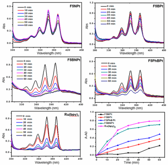 通过紫外-可见吸收光谱研究化合物的光学性质,并在蓝光LED照射下通过间接方法测定了其诱导单线态氧的能力。研究发现,吸电子诱导效应与分子内电荷转移效应协同作用使得这些化合物展现良好的单线态氧感光能力。尤其是F5BNPt化合物,在30分钟内就能诱导足够的单线态氧氧化ABDA(9,10-蒽二基-双(亚甲基)二甲酸),最高的单线态氧量子产率可达到0.47。这一发现为开发新的高效卟啉类单线态氧光敏剂提供了一种简单的合成方法,有望在光动力疗法中发挥重要作用。