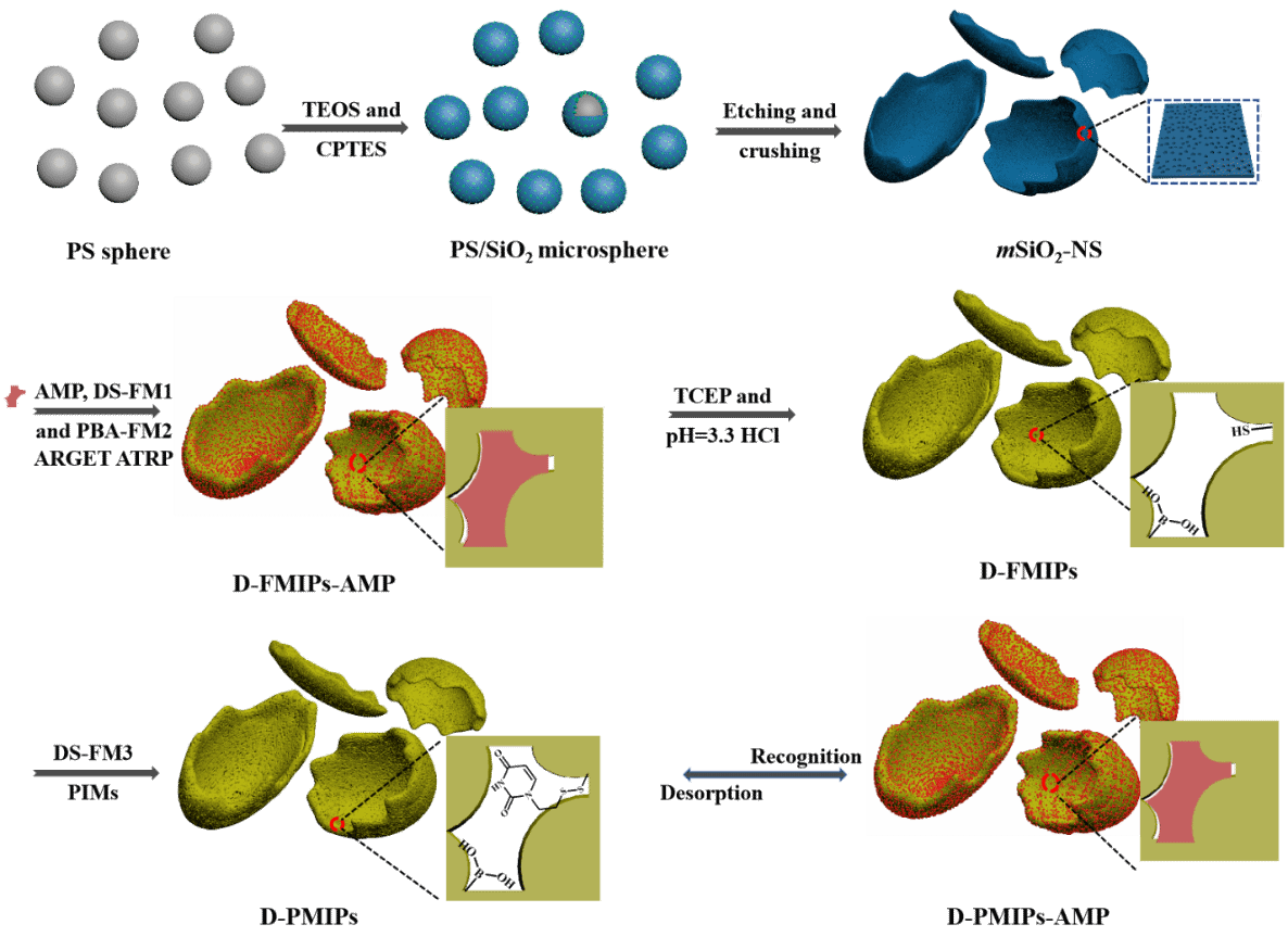 受生物表面工程的启发,该工作以介孔二氧化硅纳米片(mSiO2-NS)作为基质材料,结合表面印迹后修饰(PIMs)和双共价作用策略,制备双受体印迹后修饰复合吸附剂(D-PMIPs),并用于选择性辨识分离5′-单磷酸腺苷(AMP)。mSiO2-NS纳米片的高比表面积(498.73 m2/g),显著增加了高活性识别位点的数量。通过双共价功能单体分别与AMP进行有序组装,固定AMP分子的空间取向和排列,再结合PIMs在印迹识别位点内修饰亲和性更强的嘧啶官能团,精细调节了印迹识别位点,强化了识别位点的辨识效果。D-PMIPs的高亲和力结合位点数(Nmax)为39.99 μmol/g,显著高于单一受体的印迹吸附剂(S-BMIPs和S-PMIPs)。因此,使用双共价受体和PIMs是制备具有高辨识活性的印迹吸附剂的有效策略,可实现印迹识别位点的精准构筑。