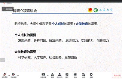 大学生科研课题立项是指大学生从事课外学术研究、科技制作和发明。韩涉老师详细地讲解了科研立项的相关事宜、流程及对同学们的意义,对申报、评审、科研、结题、报销等各环节及注意事项做了详细说明,并鼓励大家积极参与科学技术研究与创作发明。陈宇老师谈到,学院注重科研育人作用发挥,加强对学生科研项目的指导、监督和跟踪,确保工作实效。鼓励同学们在科研方面获取新的知识并取得相应进展。随后,在互动提问环节,老师们分析了一些常见的问题,并回答了同学们的提问,做了有针对性的指导。