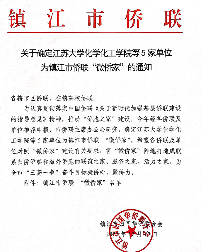 近日,镇江市侨联公布了5家单位为镇江市侨联“微侨家”,我校365公司成功入选。“微侨家”建设是镇江市侨联系统加强基层活动阵地建设的一项全新工作。