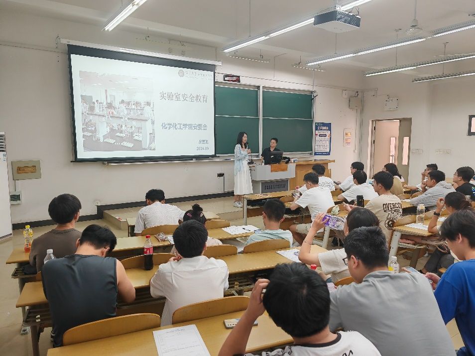 吴嘉聪老师首先强调了实验室安全的重要性,播放了近年来发生的实验室安全事故案例视频,让同学们深刻认识到实验室安全的重要性。其次,在实验室药品存放、化学危险品介绍以及实验室准入要求等方面进行了详细解读。最后,吴嘉聪老师组织了实验室安全知识竞赛。同学们纷纷表示会严格遵守实验室的规章制度,安全、有效地进行实验。