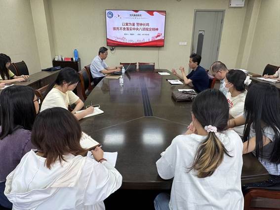 学院党委书记周国华作《以案为鉴 警钟长鸣 锲而不舍落实中央八项规定精神》主题报告。报告讲述了多起违反中央八项规定精神典型案例,采用以案说德、以案说纪、以案说法、以案说责的案例剖析,强调了深入贯彻中央八项规定精神的重要性;同时总结了学院党委对照2个问题清单逐项查摆情况,以及制定的整改措施和已取得的进展成效。周国华指出,党员同志要切实把中央八项规定精神内化于心、外化于行,将学习成果转化为破解难题、推动工作的强大动力,以作风建设新成效开创学院事业发展新局面。