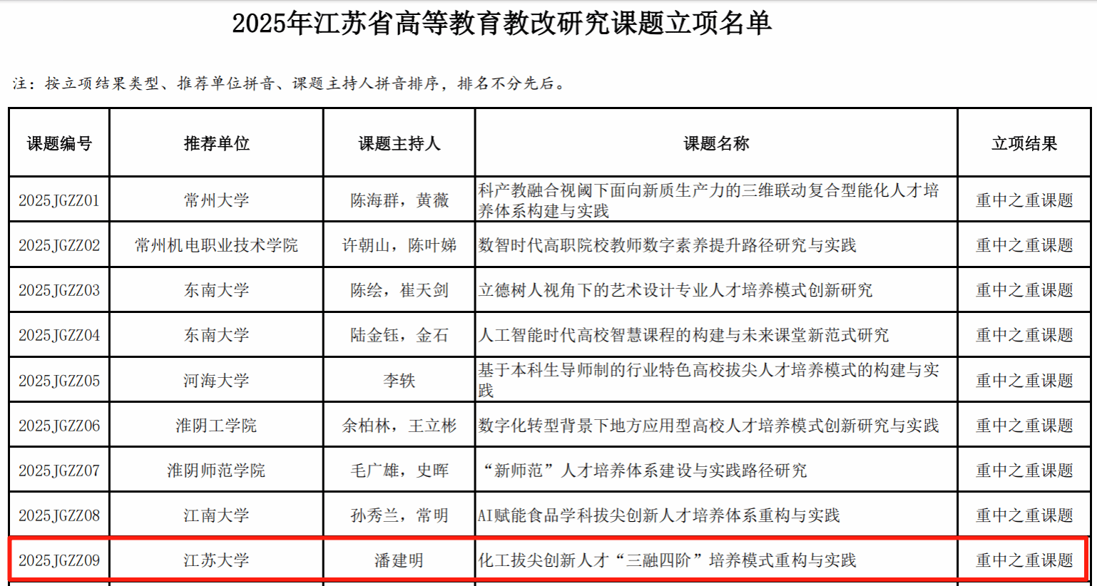 近日,江苏省高等教育学会发布《关于公布2025年江苏省高等教育教改研究立项课题评选结果的通知》(苏高教会〔2025〕30号),英国365上市公司潘建明教授主持的课题《化工拔尖创新人才“三融四阶”培养模式重构与实践》获批重中之重项目。