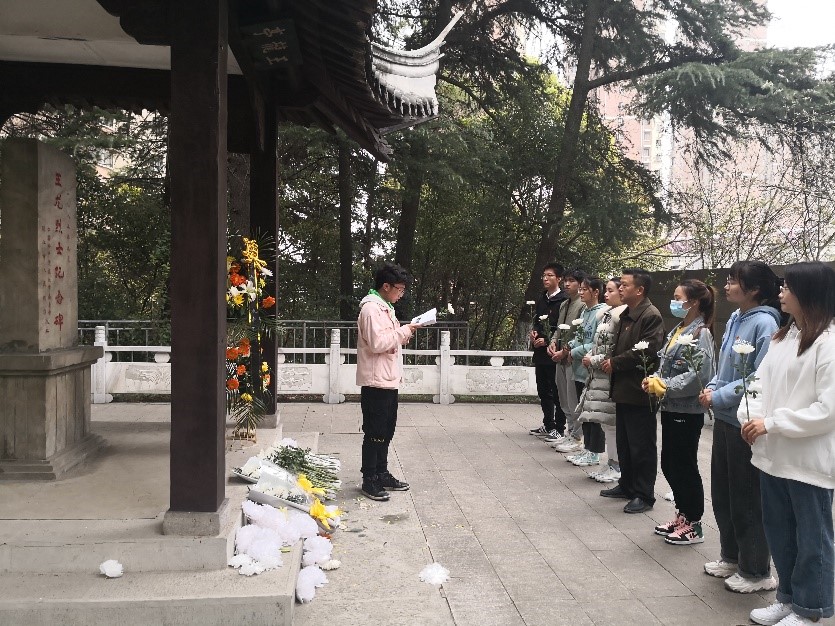 王龙亭前,党员同志和入党积极分子们肃立端正,听学先烈事迹。本科生党员代表刘笑龙同志为大家讲述王龙烈士的英雄事迹,党员同志和入党积极分子倍感震撼,表示作为新时代青年,应当学习和发扬革命先烈爱国情怀和奋斗精神。随后,大家集体面向纪念碑三鞠躬,并依次献花。