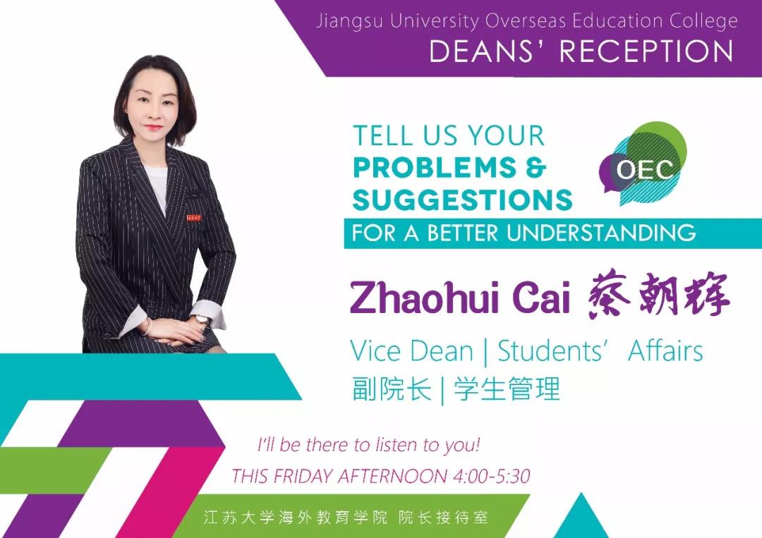 To better understand your problems, ideas and suggestions, the OEC vice dean Mrs. Cai Zhaohui will dedicate this friday afternoon for an office reception. Students are welcome to meet the deans to address any problems and suggestions. Jiangsu University is proud of offering any constructive platforms to all its students. Your ideas and suggestions are valuable to us.