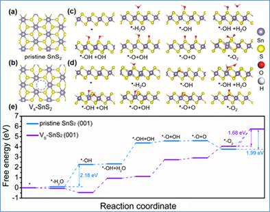 “双碳”目标下利用太阳光将二氧化碳有效地转化为可储存的燃料或简单的化学品是一项梦寐以求的技术。半导体介导的光催化CO2还原制备碳氢化合物是实现二氧化碳资源化利用的理想途径,但CO2催化转化过程中半导体结构与催化性能关系和微观界面的反应机制仍然不清。尤其是CO2光催化还原过程水氧化(OER)的半反应,涉及四电子的OER半反应受特定界面构型的高度影响,并且对CO2还原反应效率产生较大影响,可能是整个CO2光还原中的速率限速步骤。依此,绿色化工技术团队在SnS2原子薄层上精心设计的S空位促进OER半反应来提高整体CO2光还原效率。所设计出的Vs-SnS2 (23.07%)催化剂在光催化CO2还原中表现出高达25.71μmol g-1 h-1的CO析出率,光催化效率为初始SnS2催化剂(CO析出率为3.14μmol g-1 h-1)的8.2倍。原位DRIFTS和DFT计算表明,S空位有利于决速步的OER半反应,从而加速空穴消除/质子释放,促进CO2还原半反应。该研究对半导体光催化剂上缺陷位点、CO2和水之间关系的新认识得到进一步深入。
