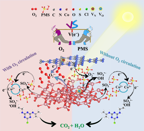 该工作构建了具有合适缺陷浓度的双空位S型异质结VO-M-Co3O4@CNx,表现出优异的PMS活化能力和光激发协同作用,实现了无曝气高效降解有机污染物。VO-M-Co3O4@CNx 在厌氧条件下的降解速率(4.58 min-1 g-2)高于有氧条件下的降解速率(1.67 min-1 g-2),优于典型的异质结催化剂降解体系。原位实验和DFT 研究揭示缺陷诱导的光生电子介导的PMS活化,阐明O2和PMS在 VO-M-Co3O4@CNx 上的竞争相互作用。该研究首次强调了催化剂中O2和PMS之间的竞争作用是调控PMS活化协同光激发的关键,对开发无需曝气的高级氧化工艺协同光催化在水处理领域方面产生重要意义。
