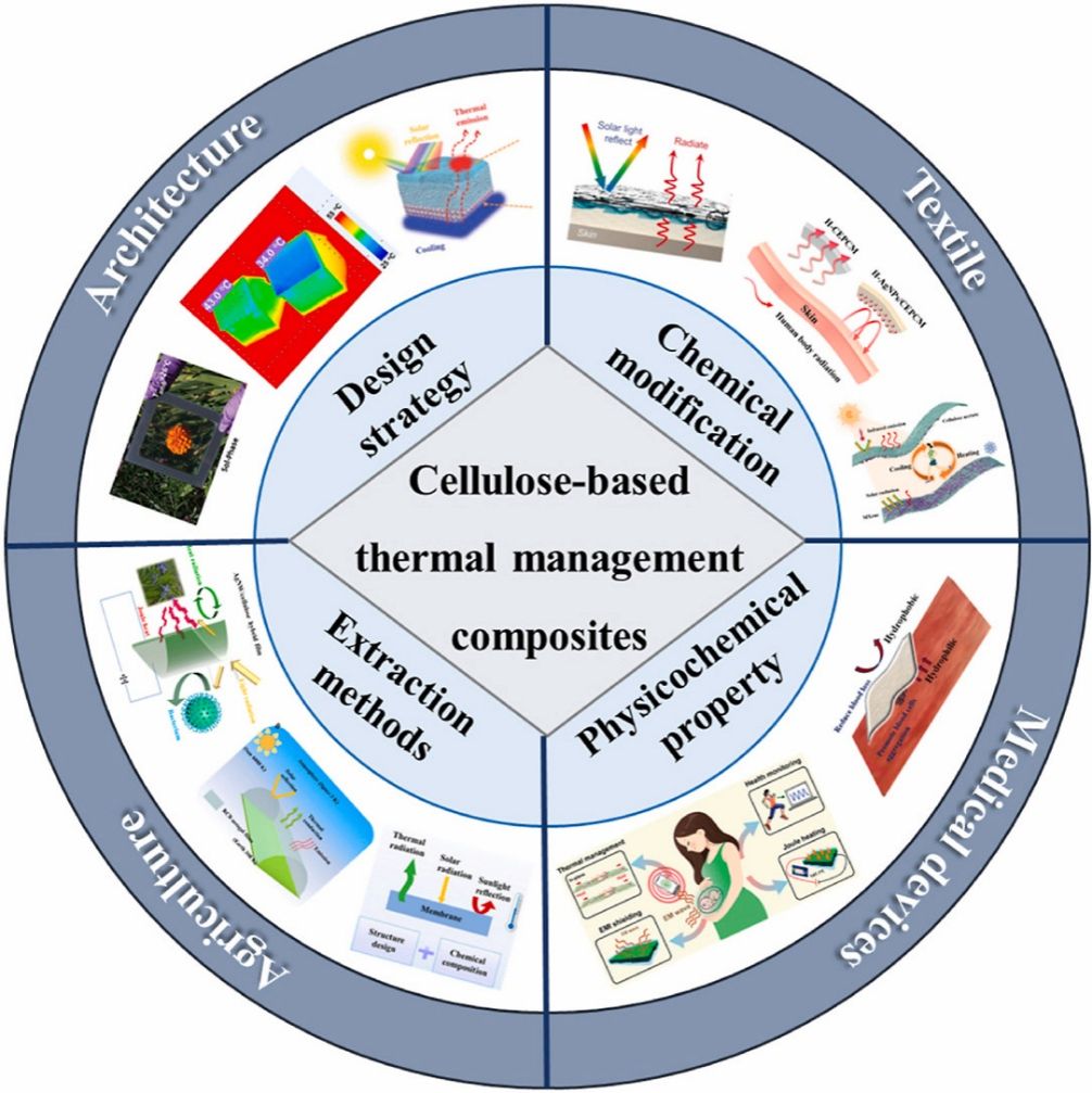 因此,本综述对近年有关纤维素基热管理材料进行了总结。首先,对常见的农业废弃物进行讨论,对内部所含有的纤维素进行归纳,总结了不同类型纤维素之间的转化关系;随后,讨论了纤维素的理化性质、提取方法和改性手段,并对相关方法的优缺点进行区分。此外,详细探讨了热管理技术的理论与现状,并总结了不同温度需求下的热管理调控策略。最后,在此详细综述的基础上,对纤维素基热管理材料在不同领域中的应用进行叙述,并分别从工艺优化、材料功能集成和智能化等多方面对这一复合材料所面临的挑战和前景进行了总结。