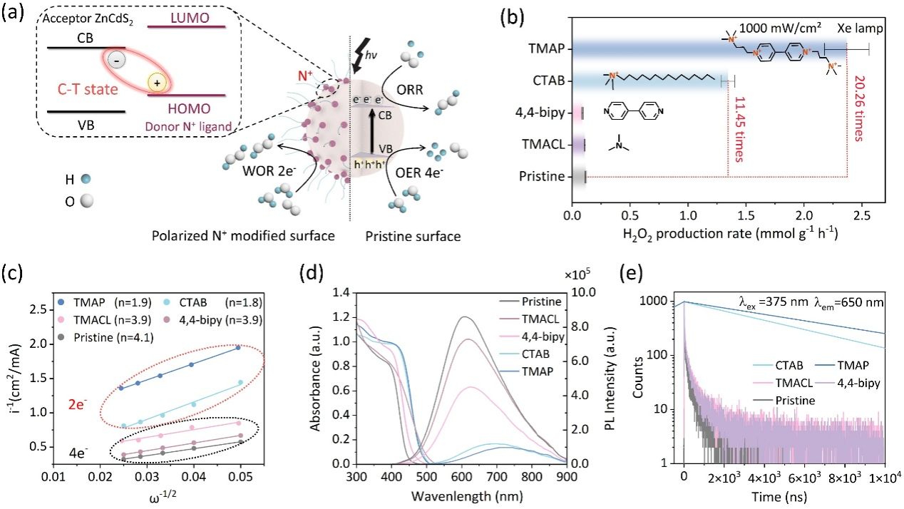 过氧化氢的绿色合成是能源化学领域的核心挑战之一。传统光催化体系受限于水氧化反应中四电子析氧路径的热力学优势,难以实现双电子路径的高选择性调控。本研究创新性地提出表面极化工程策略,通过在ZnCdS₂光催化剂表面锚定极化N⁺配体,构建长寿命电荷转移激发态,将光生空穴的氧化能力精准调控至适于双电子反应的区间,并利用N⁺中心的静电作用稳定关键*OOH中间体,成功将水氧化路径从四电子析氧导向双电子过氧化氢合成。在无牺牲剂的纯水体系中,改性催化剂的过氧化氢产率提升超20倍,并通过连续流动反应器验证了其实际应用的可行性。此项研究为解决多电子反应路径选择性调控这一共性难题提供了新范式,标志着我校团队在光催化水氧化研究领域取得了重要进展。