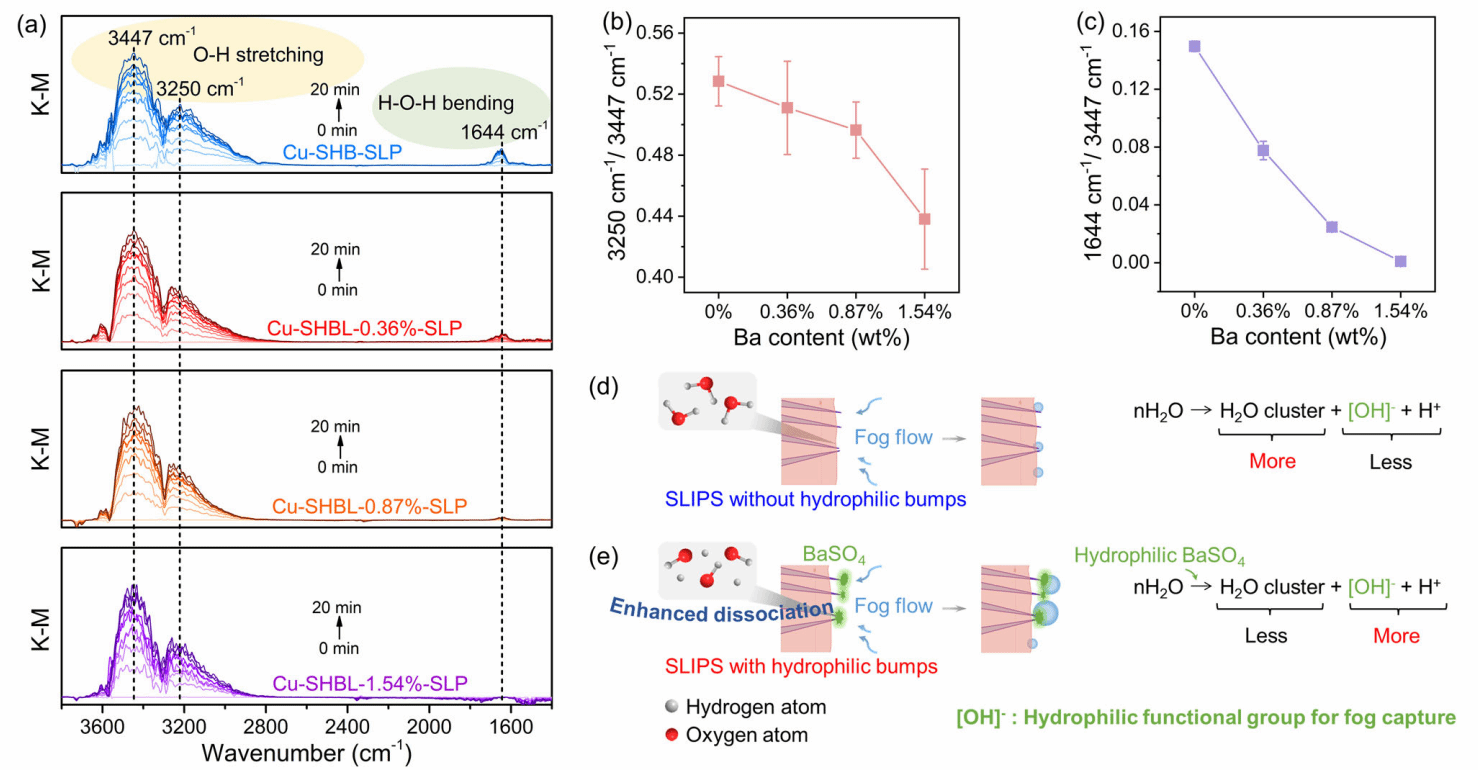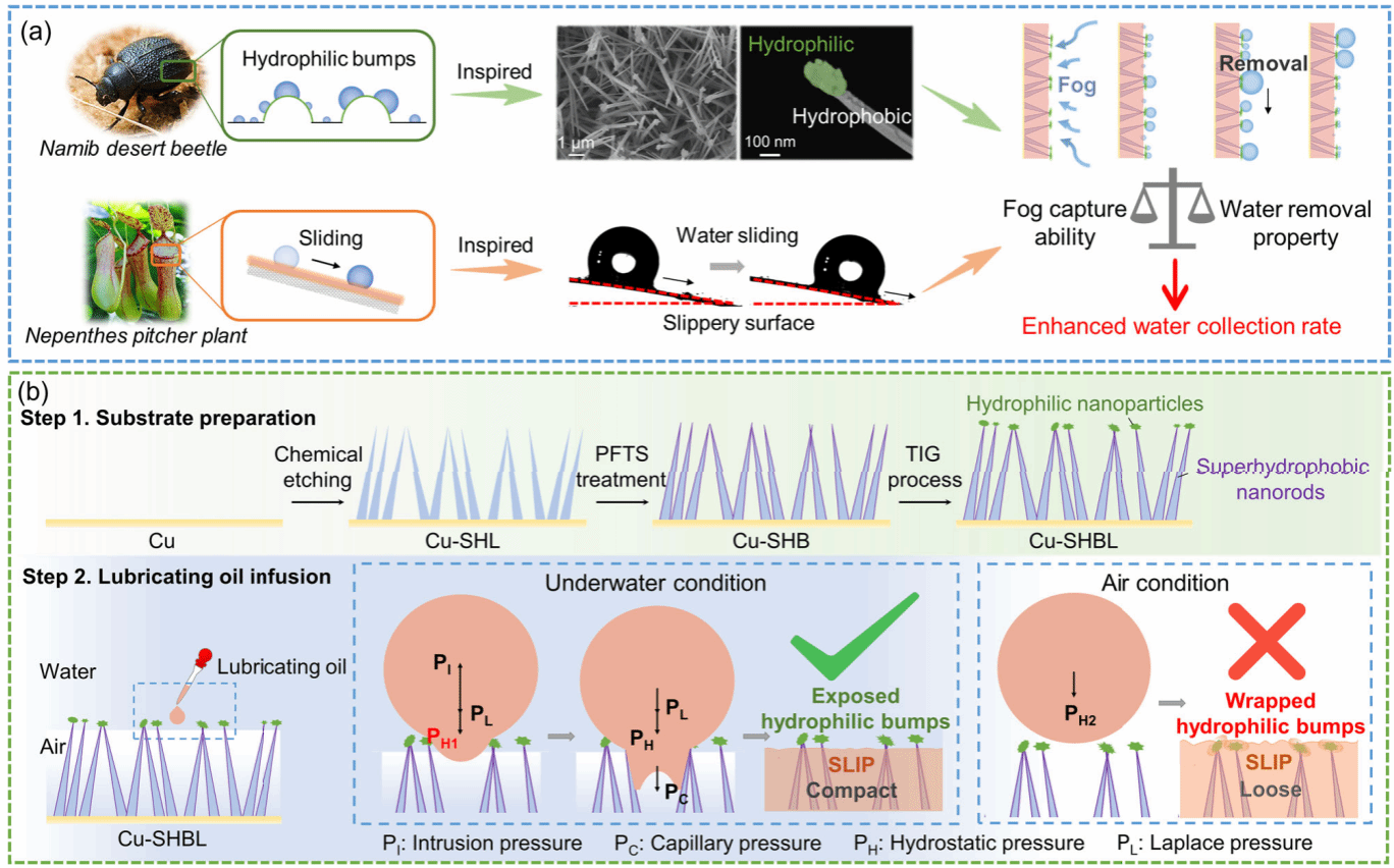 雾水收集技术是解决干旱地区水资源短缺问题的潜在途径,但其效率长期受限于雾滴捕获与水滴输送之间的平衡难题。研究团队受沙漠甲虫亲水突起与猪笼草超滑移表面启发,创新性提出“水下灌注润滑油”策略,在光滑注液多孔表面(SLIPS)上成功构建具有多尺度仿生结构的超滑移雾收集界面。该界面融合亲水区域的快速捕获能力与超滑移表面的高效传输特性,实现了雾滴捕获与水滴输送的协同优化。制备的集雾片在雾流量为300-1500 mL/h条件下,集水速率达5000–60000 mg cm⁻⟡ h⁻¹,为目前公开报道的最高效率之一。通过宏观结构设计与系统集成,研究团队进一步开发了一体化雾水收集装置,在500分钟内可收集超过660 g水。此外,通过在亲水突起中集成二氧化钛光催化剂,该器件在高效集水的同时实现了对水体中有机污染物的同步降解,拓展了“集水‑净化”一体化技术路径。此项研究是江苏大学在界面科学与可持续水资源技术交叉领域的重要突破。